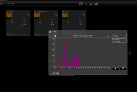 - En el apartado de eficiencia energética, se han instalado tres sondas de medición de consumo eléctrico sobre tres líneas. Se mide el consumo que generan las líneas eléctricas de iluminación, las de la sala de servidores y las del sistema de climatización. De esta forma, se pueden aplicar fácilmente políticas para la mejora de la eficiencia energética del local.